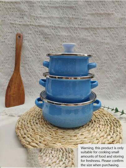 3pcs Enamel Mini Pot Set, 12cm-14cm-16cm Thick Double-Ear Enamel Cooking Pot, Multi-Purpose For Gas & Induction Cooktop, Vintage Style Enamel Soup Pot, Small Pot For Boiling Milk, Enamel Bowl With Handle For Instant Noodles - Multicolor - View 1