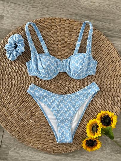 3pcs Jacquard Fabric Bikini Set With Wide Strap, Underwire, And Head Rope Summer - Blue - View 1