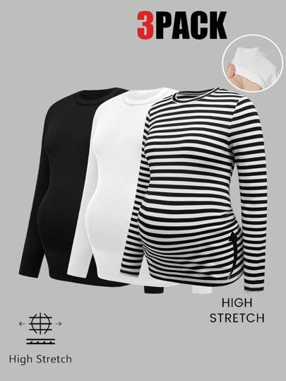 SHEIN 3pcs Maternity Simple Pattern Long Sleeve Cropped T-Shirts - Black and White - View 1