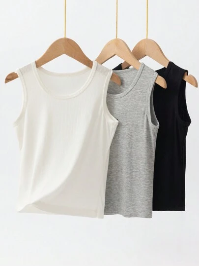 3pcs/Pack Kids' Solid Color Ribbed Soft Fitted Camisoles, All Season - Multicolor - View 1