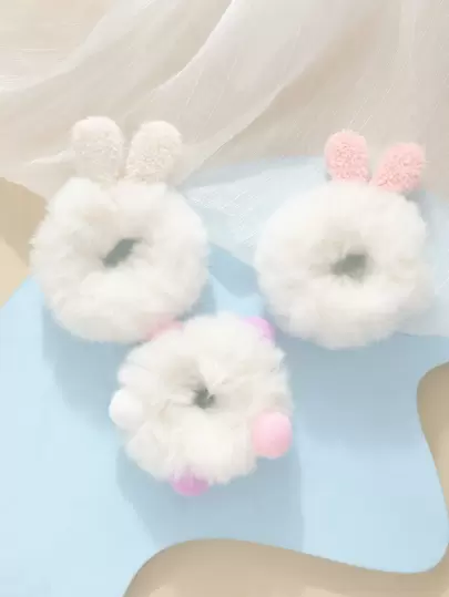 3pcs Rabbit Ear & Pom Pom Decor Fluffy Hair Tie - Multicolor - View 1