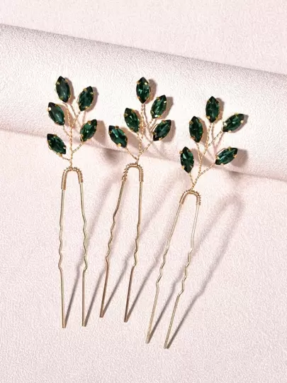 3pcs Rhinestone Decor Green Hair Pin Boho Hair Bun Hair Bun Maker Bun Hair Piece Hair Styling Pins, School Stuff, Hair Accessories, Head Accessories - Dark Green - View 1