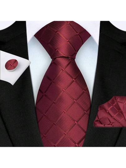 3pcs Set Burgundy Plaid 8cm Necktie, Pocket Square, Cufflinks Men Formal Tie Set, High-Quality Fashion Casual Wedding Party Business Tie Suit - Burgundy - View 1
