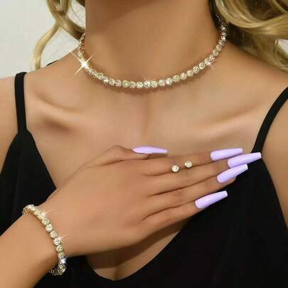 3pcs/Set Classic Jewelry Rhinestone Necklace, Bracelet, Earrings & Choker Set, Large Rhinestone Claw Chain Necklace Accessories - Gold - View 1