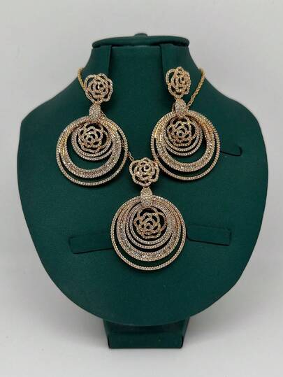 3pcs/Set Luxury Exaggerated Floral Design Cubic Zirconia Full Rhinestone Rose Gold Necklace And Earrings Jewelry Set, For Women Daily, Party, Wedding, Gift For Girlfriend, Teacher - Necklace and Earrings - View 1