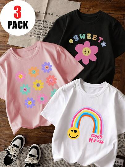 3pcs/Set Tween Girls Casual Printed Round Neck Short Sleeve T-Shirt, Summer Student Young Children Clothing - Rainbow Floral Face Printed T-Shirts Bring Joy And Happiness To Every Child! - Pink - View 1