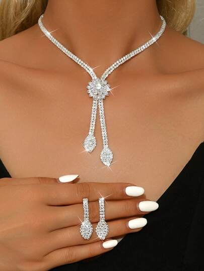 3pcs/Set Water Droplet Hollow-Out Design Bridal Women's Fashion Crystal Necklace Set, Luxurious Jewelry Set Suitable For Weddings, Birthday Gifts, And Parties. - Silver - View 1