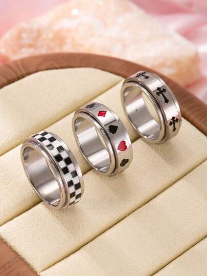 3pcs Stainless Steel Fashionable Personalized Hip Hop Rotatable Stress Relief Rings, Cross, Playing Card, Checkerboard Pattern, Unisex Accessories Suitable For Daily Wear, Festivals, Dates, Gifts - Silver - View 1