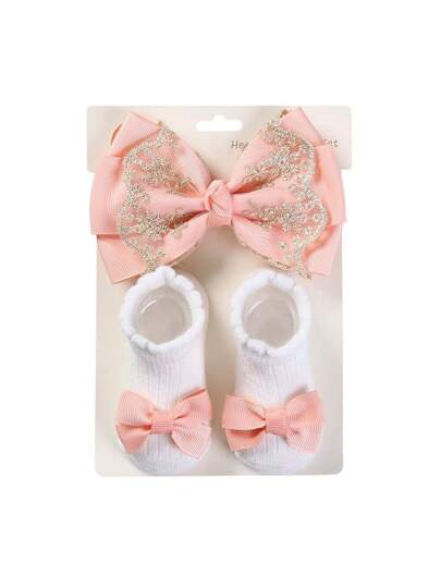 3pcs/set Baby Girls' Ribbon Bowknot Socks And Headband Set, White Lace Bow And Cute No-slip Socks For Newborns Learning To Walk - Coral Orange - View 1
