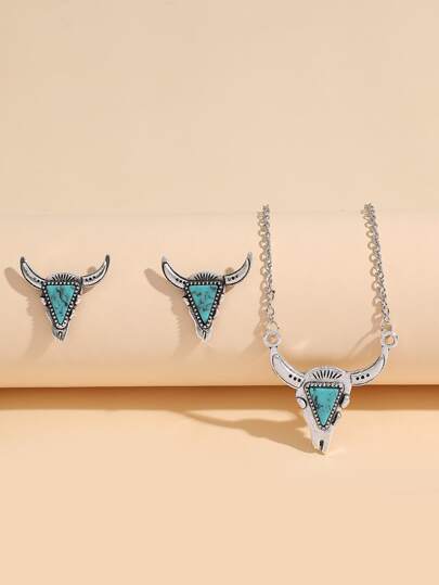 3pcs/set Turquoise Decor Bull Head Decor Jewelry Set - Silver - View 1