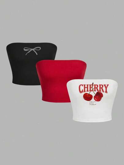 SHEIN PETITE 3pcs/Set White Cherry Print Tube Top, Red Solid Tube Top, Black Rhinestone Bow Decor Tube Top - Multicolor - View 1