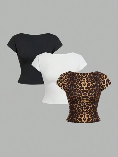 SHEIN EZwear 3pcs/Set Women Leopard Print Casual Cropped Backless Short Sleeve T-Shirt Suitable For Going Out - Multicolor - View 1