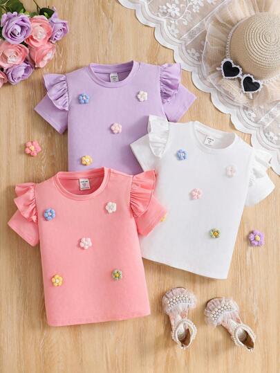 SHEIN 3pcs/Set Young Girl Knit Solid Color Round Neck 3D Flower Fitted T-Shirt - Multicolor - View 1