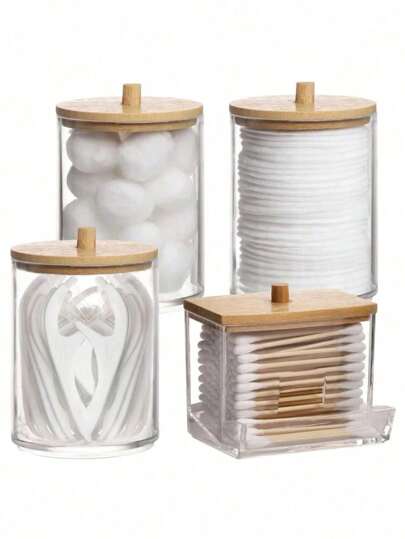 4 Packs Qtip Holder Cosmetic Containers, 10/7 Ounce Makeup Round Pad Swab Dispenser, Medicine Bottles With Bamboo Lids For Organization And Storage - Multicolor - View 1