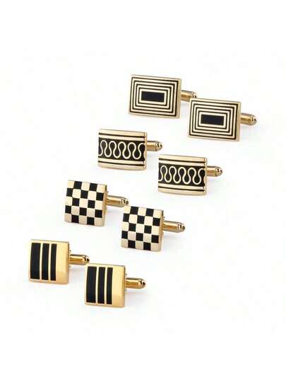 4 Pairs Gold Plaid & Striped Copper Alloy Cufflinks, Elegant Gift Box Set For Men, All Season - Gold - View 1