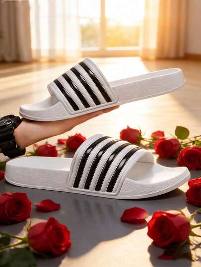 4-Season Indoor Home Slippers, Casual Fashion Slippers, Foam Slippers, Soft & Comfortable, Serrated Outline, 4-Stripe, Couples Slippers, Indoor Bathroom Slippers, Outdoor Casual Beach Slippers, Pool Slippers, Sports Slippers, Slip-On, Slip-On Sandals - White - View 1