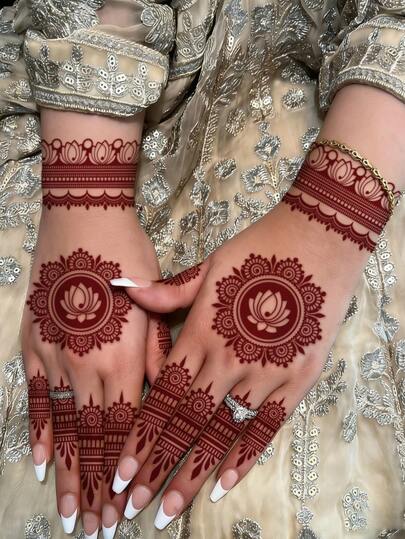 4 Sheets Full Hand Flower Design Brown Red Maroon Sexy Foot Finger Hand Tattoo Sticker Women Flower Henna Tattoo Sticker Flower Waterproof Sticker Brown Tattoo Sticker Women Body Art Sticker Wedding Party Brown Red Tattoo Sticker - Red - View 5