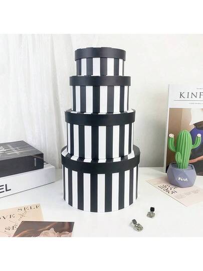 4pcs Black & White Striped Round Nested Boxes, Minimalist Modern Style, Multi-Functional Storage Boxes, Solid Color Gift Packaging Boxes - Black and White Stripes - View 4