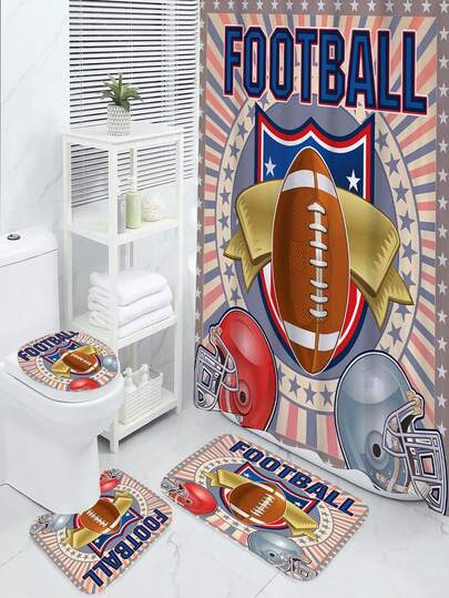4pcs Creative Football Pattern Print Shower Curtain, Waterproof Curtain, 12 Hooks, Bathroom Mat, U-Shaped Toilet Mat, Toilet Cover, Bathroom Decoration, Bathroom Shower Curtain Set - Multicolor - View 1