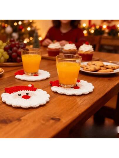 1pc/4pcs Handmade Crochet Santa Claus Coasters - Holiday Red & White Decor, Durable Fabric Drink Coasters, Christmas Table Decor, Christmas Decorations, Home Decor, Christmas Ornaments, Unique Fun Christmas Gift, Christmas Theme Party Decor, Soft Handcrafted Coasters, Great For Home, Office And Birthday Gifts - Multicolor - View 1