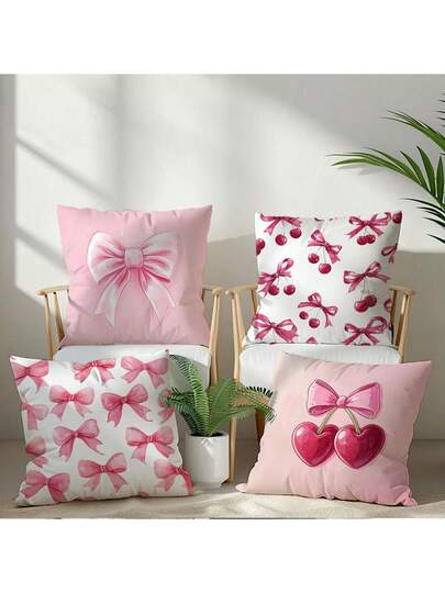 4pcs Pink Cherry Blossom Bow Decorative Pillow Case Set, Single-Sided Soft Peach Velvet Material, 45*45/50*50/40*40CM Cushion Cover Suitable For Indoor Decor, Party Decoration, Decorative Pillow Gift - Pink-4PC - View 1