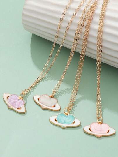 4pcs/Set Cute & Minimalist Design Oil Drip Heart & Planet Necklace With Love Pendant For Girls' Daily Wear - Multicolor - View 1
