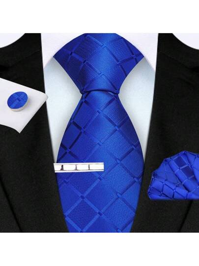4pcs Set Navy Blue Plaid Necktie, Pocket Square, Cufflinks, Tie Clip Suit For Men, High Quality Fashion Casual, Wedding, Party, Business Tie Set - Royal Blue - View 1