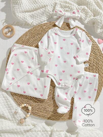 4pcs Set Newborn Soft Cozy White Textured Fabric Cute Heart Print Long Sleeve Romper, Pants, Headband, Baby Wrap Swaddle Sleepwear Set - White - View 1