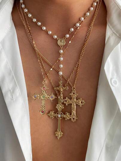 4pcs Set Rhinestone Cross Pendant Necklace, Punk Splice Sweater Chain, Stylish Street Wear Jewelry For Men & Women, Spring/Summer 2025 Accessory Gift - Necklace New - View 1