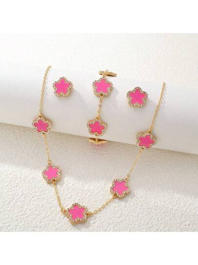 4pcs/Set Rhinestone & Shell Decorated Five-Layered Flower Necklace, Bracelet, Earrings Set For Women Valentines - Hot Pink - View 1