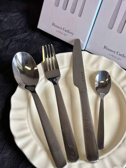 4pcs Stainless Steel Western Cutlery Set, High-End European Style Steak Knife, Fork, Dessert Spoon, Ice Cream Spoon, Salad Utensils, Silver - Silver - View 1