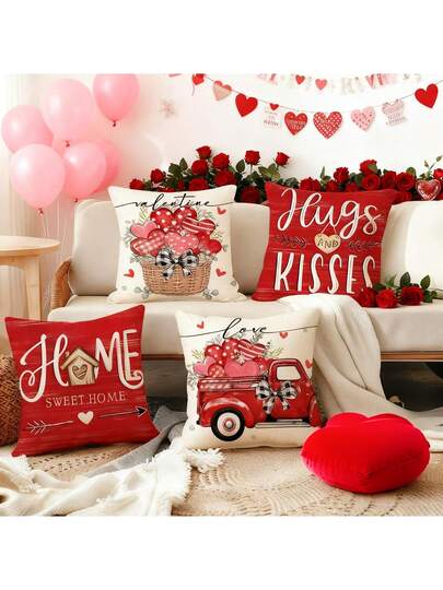 4pcs Valentine's Day Pillow Covers, Sweet Home Heart Flower Truck Design, Romantic Valentine's Day Decor, Minimalist Polyester Fabric Zipper Closure Single-Sided Printed Cushion Covers, Pillow Inserts Not Included, Suitable For Sofa, Bed, Chair Decor In Bedroom, Living Room, Farmhouse, Patio - Red and White - View 1