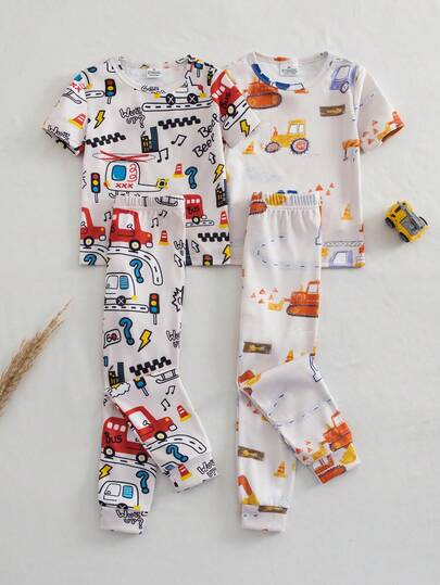 4pcs Young Boy Graphic Print Knit Crew Neck Elastic Tee And Leggings Set, Funny Car, Bus, Airplane Digital Print, Snug Fit, Sleepwear, Loungewear, Spring/Summer - Multicolor - View 1