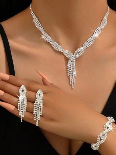 4pcs women's jewelry set with rhinestone inlaid necklaces, earrings, bracelets, wedding accessories - Silver - View 1