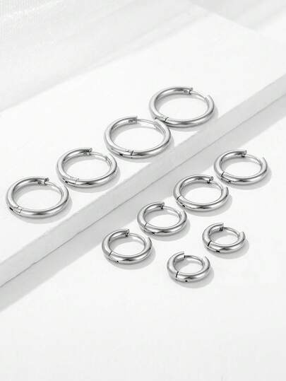 5 Pairs Gold Stainless Steel Simple Fashion Women's Hoop Earrings-Small, Medium, Large, Autumn Jewelry - Silver - View 1