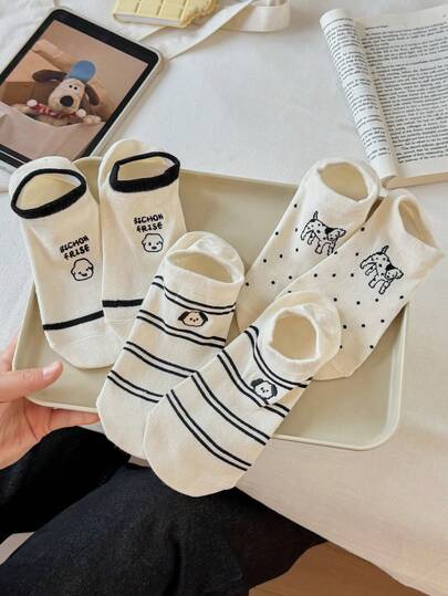 5 Pairs Women Cute Striped, Polka Dot, Puppy Pattern Minimalist Casual Boat Socks, Black & White, Random Color, Comfortable Hidden Socks Suitable For Daily Wear And Outings, All Seasons - Multicolor - View 1