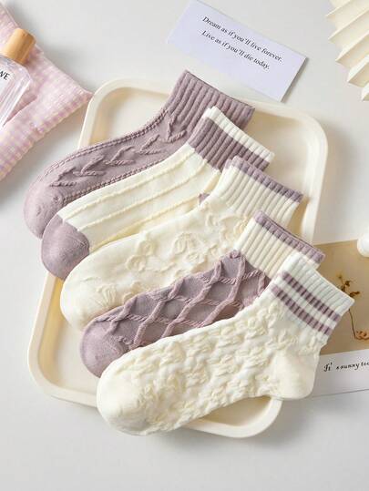 5 Pairs Women's Sweet Short Socks, White Or Purple Options, Casual & Comfortable Mid-Calf Socks, College Style Student Socks, Christmas Gift, Random Color, Suitable For Daily Wear And Outings, All Seasons - Multicolor - View 5