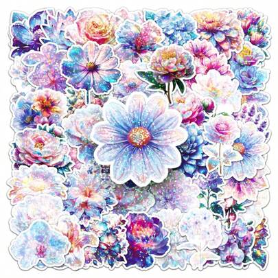 50pcs Colorful Flower Stickers, Glitter Laser Floral Plant Stickers, DIY Decorative Stickers For Scrapbooking, Water Bottles, Phones, Laptops, Back To School Gifts, Holiday Party Decor - Multicolor - View 1