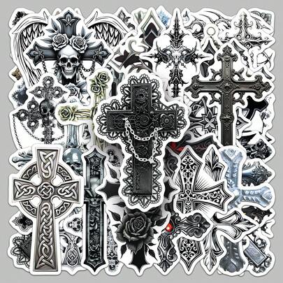 50pcs Gothic Cross Sticker Series, Unique & Cool Design, Suitable For Scrapbooking, Notebooks, Laptops, Water Bottles, Cars, Faith-Based Designs With Positive Messages, Great Gift - 50pcs/pack - View 1