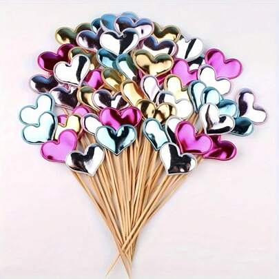 50pcs Heart Shaped Cake Toppers, Shiny & Sweet, Suitable For Weddings, Valentine's Day, Anniversaries, Bridal Showers, Birthdays, Mother's Day And Parties, Disposable Bamboo Cake Picks, Cupcake Decorations, Durable & Bamboo, Multipurpose, Perfect For Wedding Decor, Valentine's Day Decor, Wedding Supplies, Engagement, Afternoon Tea, New Year Party, Birthday Gifts, 1st Birthday, 18th Birthday, 30th Birthday, Tabletop Centerpieces, Baking Supplies, Cake Shop Accessories, Valentine's Day Gifts - Multicolor - View 1
