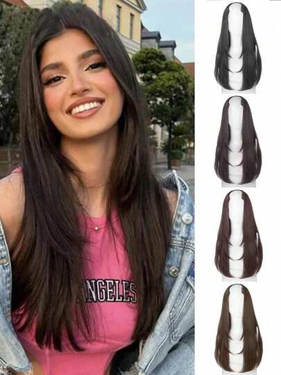 22 Inch/55cm Invisible V-Shaped Long Straight Wig For Women, With Long Curly Hair Extension Piece, Built-In Clips For Natural Looking Hair Integration - Black-brown - View 22