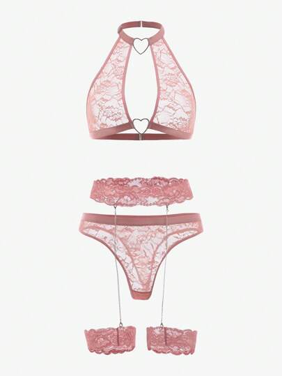 5pack Floral Lace Heart Ring Linked Lingerie Set - Dusty Pink - View 1