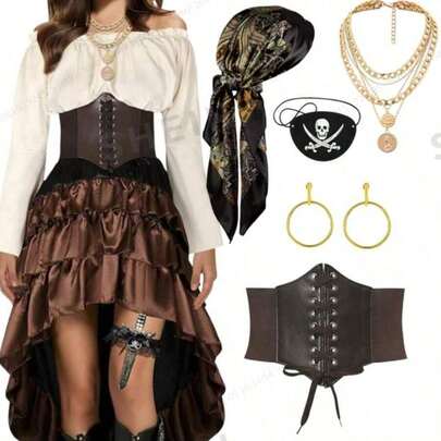 5pcs Halloween Pirate Costume Set, Including (1 Brown Belt, 1 Black Headband, 1 Earring, 1 Eye Patch, 1 Necklace), Suitable For Role Play, Halloween Events, Parties, Balls, Gatherings - Multicolor - View 1