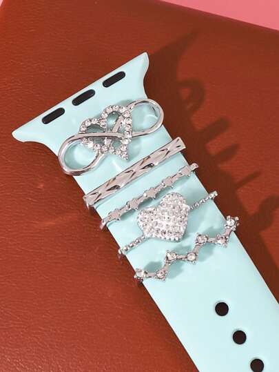 5pcs Minimalist Rhinestone Alloy Heart Charm Decor Compatible With 42/44/45mm Apple Watch Series - Silver B - View 5
