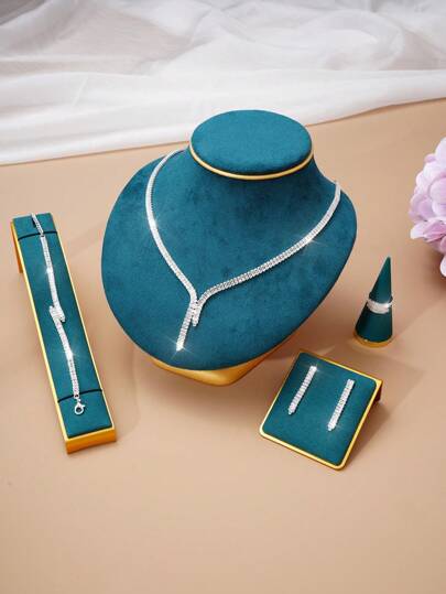5pcs/Set Fashionable Cubic Zirconia Earrings, Necklace, Ring, Bracelet Suit For Women Wedding Party, Birthday, Holiday Wearing - Silver - View 1