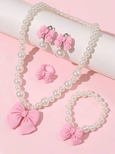 5pcs/Set Girls Cute Pearl Bow Necklace Bracelet Earrings Ring Jewelry Set, Minimalist & Versatile - Multicolor - View 19