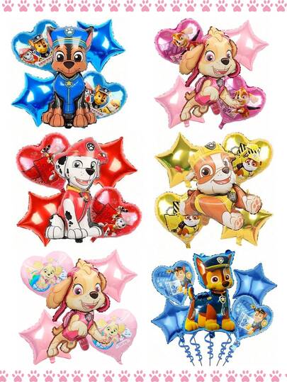 5pcs/Set Paw Patrol Theme Party Foil Balloon Set (Chase/Rubble Characters), Suitable For Birthday Decoration, Christmas Decor, Home Gifts, Christmas Ornaments - Multicolor - View 1