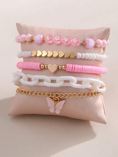 5pcs/Set Pinky White Tone Butterfly & Heart Pendant Bracelet Set For Girls - Multicolor - View 1