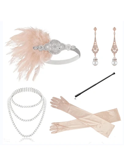 Roaring 20s Flapper Accessories Set For Great Gatsby Party, Including Headband, Necklace, Gloves, Earrings, Cigarette Holder, Black & Gold - Champagne - View 1