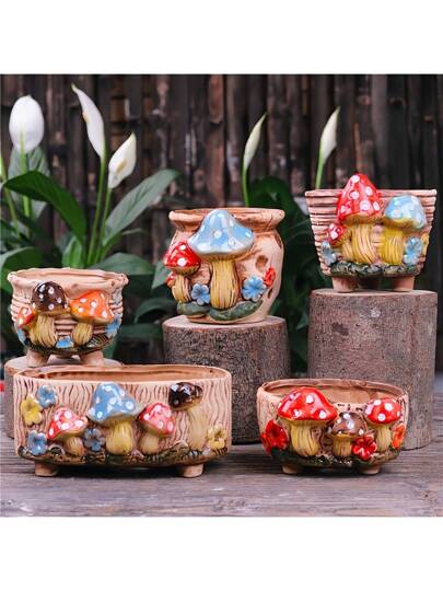 5pcs/Set New Design Mushroom Textured Ceramic Succulent Planter Pots, Home Decor For Windowsill And Balcony - Multicolor - View 1